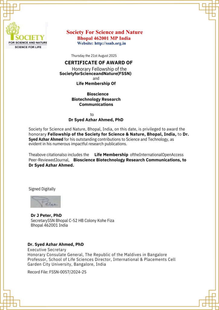 Serving as the Executive Secretary, Honorary Consulate General of the Republic of Maldives in Bangalore, he also leads as Professor and Director of International Office at Garden City University, Bangalore, India. A passionate educator and researcher, Dr. Ahmed has contributed significantly to Food Microbiology, Fermentation Technology, Agricultural Biotechnology, Nanotechnology and related areas, publishing numerous papers in reputed international journals.
